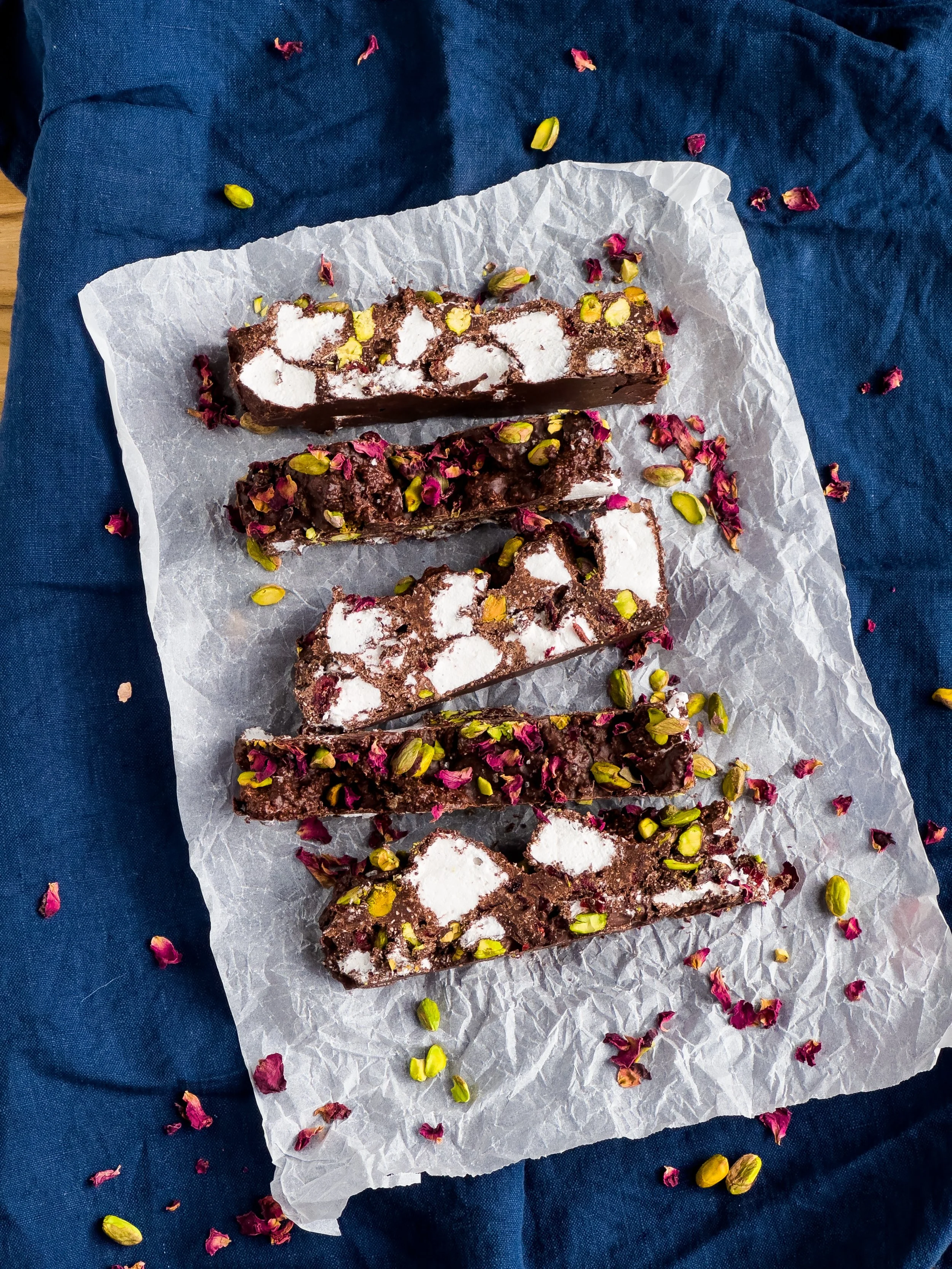 Rose marshmallow (lighter than clouds) made right here from scratch, Belgian chocolate, dried cranberries, pistachios, toasted coconut, a little Australia sea salt and some rose petals to complete the bouquet.